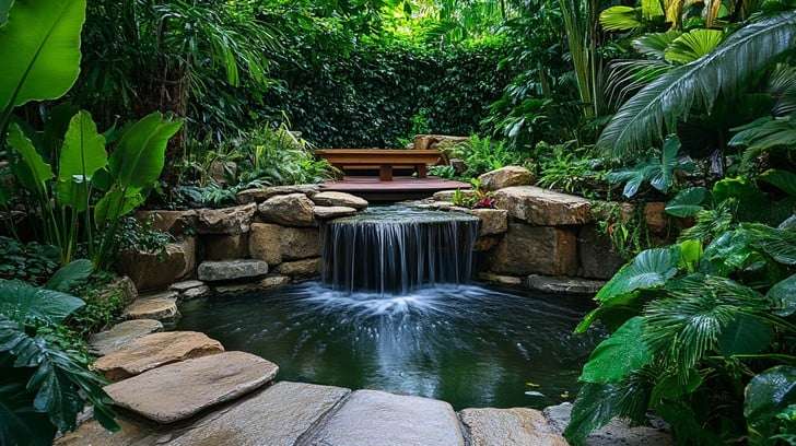 Waterfall gardens that have a pond are a terrific and serene waterscape feature for their decorative appeal and the relaxing sound of the water. However they can also be a natural living home for fish life and plant life. Many home and business owners love having fish in their waterfall gardens and often will choose a design that has a pond. The ability of having a living aquarium filled with fish in your backyard has become very common when home or business owners are looking for a tranquil and relaxing setting with their waterfall gardens.